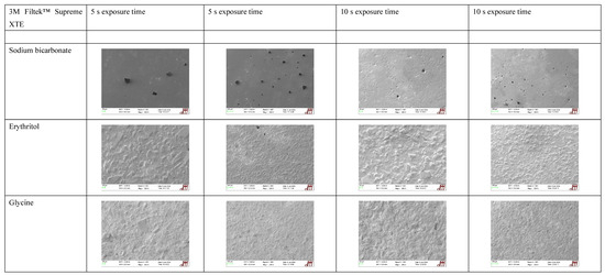 Interestingly, the effect of exposure time is more pronounced with sodium bicarbonate than with erythritol or glycine. Specifically, extending the polishing time from 5 to 10 s leads to a substantial increase in surface roughness for sodium bicarbonate, while the changes are less significant for the other powders. This observation underscores the importance of controlling exposure time, especially when using more abrasive powders, to prevent excessive roughening of the restoration surface [23]. It also suggests that, while longer exposure times may be necessary for effective cleaning, they must be balanced against the potential for increased surface damage.