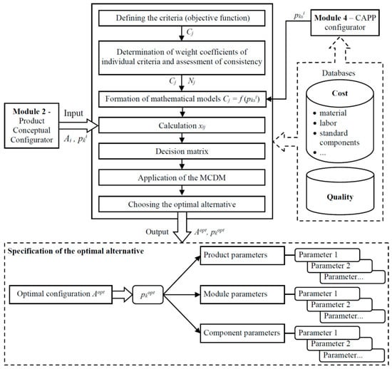 Optimization is a key stage in the configuration of complex products. Complex products usually have a modular architecture and are formed by combining standard modules. The modular product system also includes the production of parts and modules in sufficiently large series, an acceptable number of technologies, tools, and accessories, and reduced amounts of information. Also, the construction of available modules and their components has already been optimized, and the technological processes of production and assembly have been standardized and optimized from the aspect of processing modes, costs, processing time, etc. Therefore, that part of the optimization process was not considered in this paper. Configuration optimization has the task of performing multi-criteria evaluation of products at the macro level in terms of cost, quality, and production time and is solved by multi-criteria decision-making methods [1].