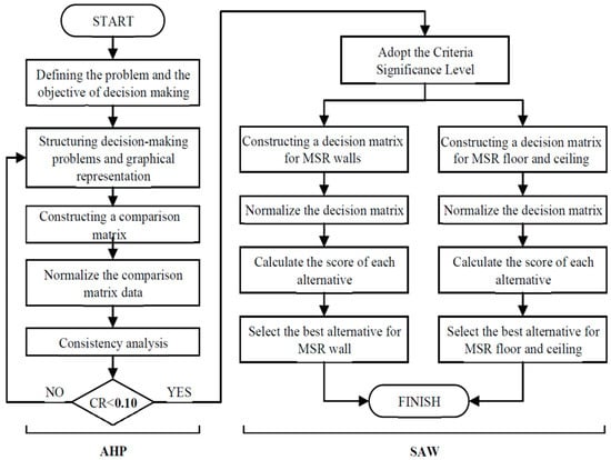 The algorithm for applying the integration of these two methods (Figure 4) consists of 10 steps which will be explained below. Due to the specifics of the MSR, the proposed selection procedure using the SAW method (steps 7 to 10) was carried out twice, i.e., for walls and separately for floor and ceiling MSR.