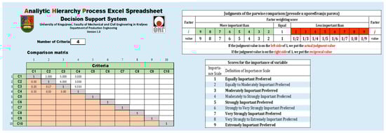 To determine the priorities of the criteria, i.e., importance of each criterion relative to the main objective, the AHP method uses pairwise comparison [14,15,16]. For this purpose, a comparison matrix is formed (square matrix n × n) in which each criterion in a row is compared with each criterion in the column at each level of the hierarchical structure. The Saaty scale for the importance of value was used for comparison [16,17].