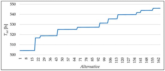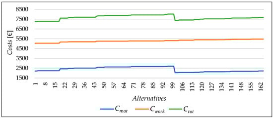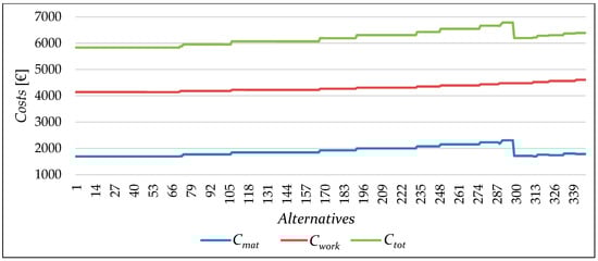 The results of selecting the optimal configuration for the selected example are presented below in the form of graphs of individual and cumulative objective functions obtained by the generated alternatives. The graphs of the obtained criterion functions for the walls are shown in Figure 7, Figure 8, Figure 9 and Figure 10.