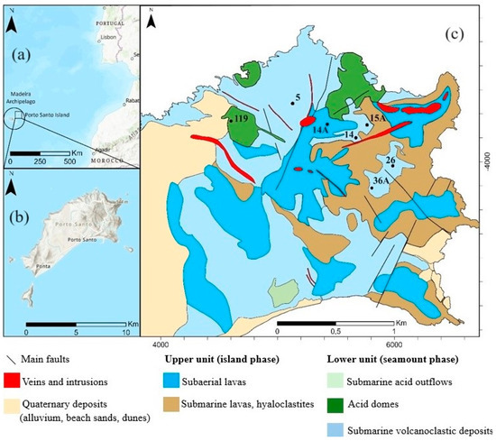 The geographic settings of Porto Santo Island and the Madeira archipelago (a,b) and the geological setting of Porto Santo Island with the sampling distribution (c).