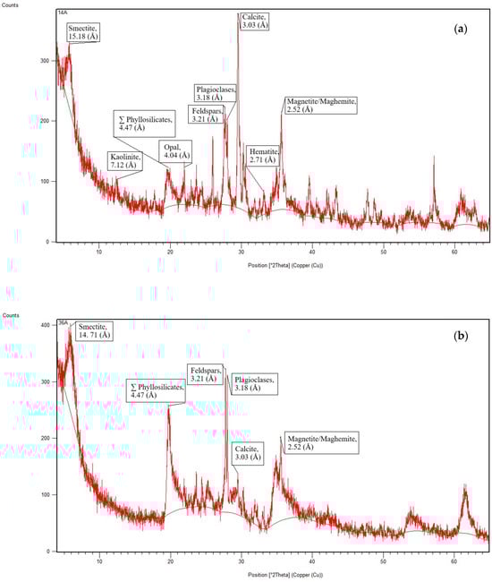 The presence of magnetite/maghemite and hematite in these samples explains the concentrations of Fe2O3 (8.20–12.50%) (Table 2 and Table 3), as well as the reddish colour of the samples. Opal is present in most samples (except in Sample 36A). According to Ferreira and Serrano [41], the common clays formed by submarine diagenesis do not have quartz in their mineralogical composition, as it can be seen in XRD graphs (Figure 3a,b), although Sample 26 is the only one with minor concentrations of quartz.