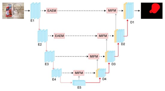 Figure 2. The EAEM module extracts edge feature information from the first and second low-scale downsampled features at the encoding stage, while the MIFM module focuses on channel information extraction from all downsampled features. These modules are interconnected during the adjacent upsampling process in the decoder, facilitating further information aggregation for feature fusion.