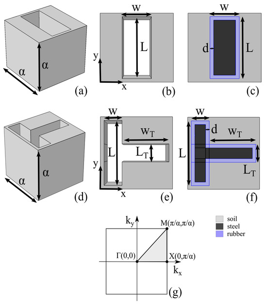 The protection of critical infrastructure against a seismic event or ground vibrations that could be created from manmade sources, such as a railway or an industrial unit, is mandatory, and the scientific and technological community are seeking effective ways for achieving this goal. At the present contribution, the artificial structures that were studied numerically were based on the well-known concepts of PCs and AMs. This study included a first set of calculations of the band structure for each studied geometry. The results for the I-shaped LSPMs showed PBGs only along the ΓΧ direction, whereas the relevant calculations for the T-shaped LSPMs provided complete PBGs along all directions of the first Brillouin zone. After a numerical research for the optimum parameters, the I-shaped geometry provided an optimal performance for length and , whereas the best performance for the T-shaped geometry was achieved by minimizing the horizontal part of the T-shape and therefore for , , , and for . For all the examined cases, the lattice constant was kept at . The filling of each structure with a rubber-coated steel core reduced the lower limits of the PBGs for specific cases, although this reduction was not significant and the widths of the PBGs were smaller compared to those of the empty trenches, either of I-shape or T-shape.