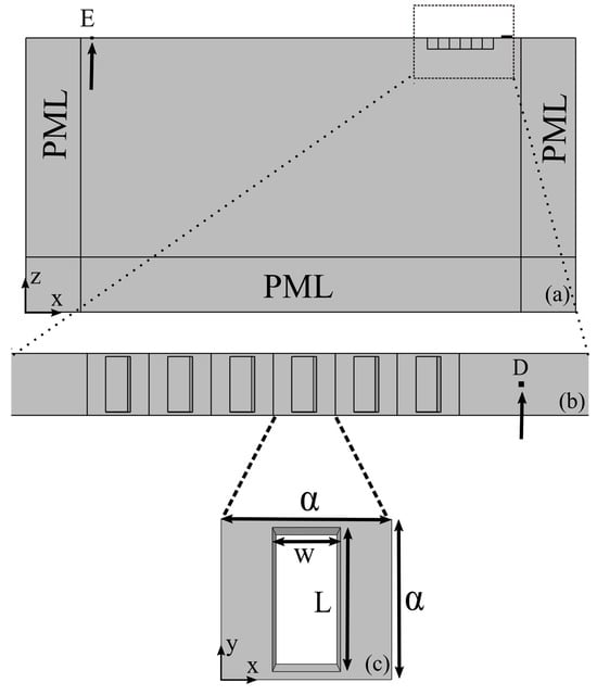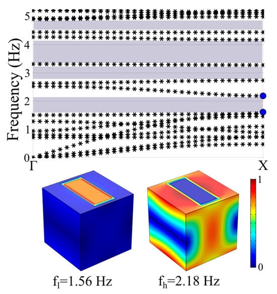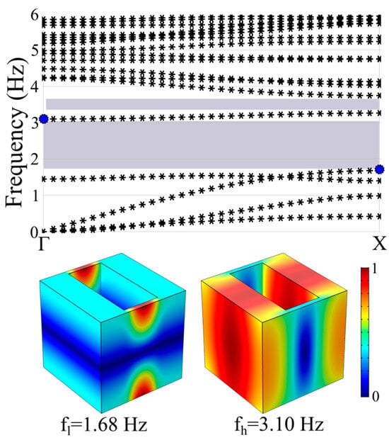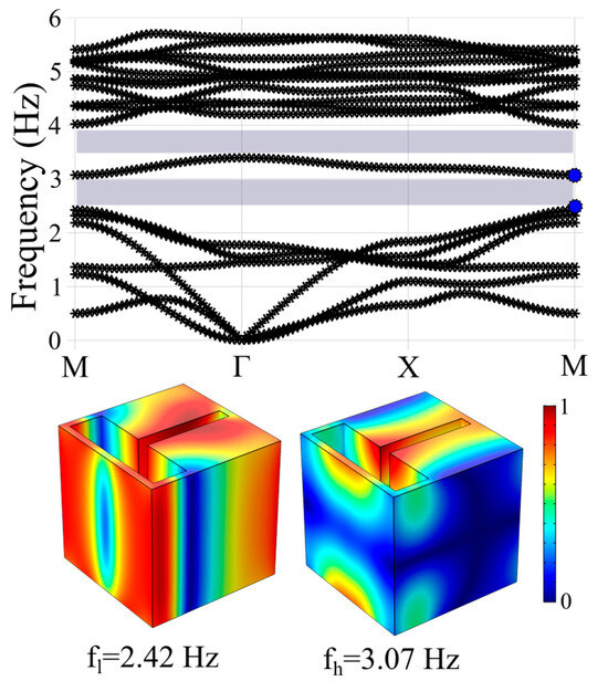 For the calculation of the band structure of each proposed geometry, the Bloch theorem together with the finite element method, which is included in the commercial software package COMSOL(5.5) Multiphysics, were used. Bloch–Floquet periodic boundary conditions were considered at the vertical sides of each unit cell, whereas free boundary conditions were used at the top and bottom sides of each unit cell. Thus, the real eigenvalues of each structure were calculated along the high-symmetry directions,