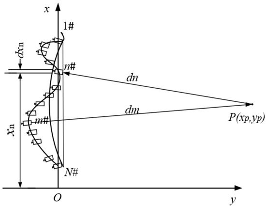 Let us consider the presence of a scatterer, denoted as P(xp,yp), within the imaging area of the arc sparse array, as illustrated in Figure 2. The scatterer is positioned in the far field of the array elements. When the sound wave emitted by the array element m is reflected or scattered by the scatterer P, the echo energy Smn(xp,yp) is received by the array element An. This energy is equivalent to the integral of the sound wave energy density, denoted as , along the width of at the front edge of the receiving array element An. This integration is taken over the propagation time tmn of the sound wave. Mathematically, it can be expressed as follows: