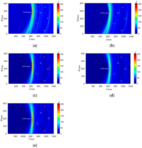 The coordinate data of artificially defective holes in the welded structural plate were tested to determine the coordinate values of defective holes A, B, C, D, and E in the image, to explore the relationship with the location of the defects in the actual experiments, and to draw the image, as shown in Figure 4.