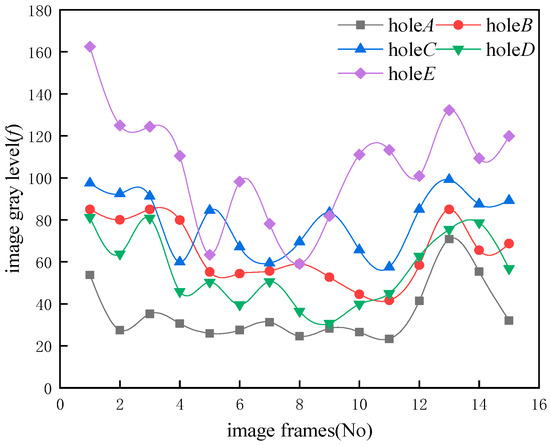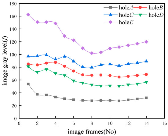 Table 2 indicates the grayscale trend of the multi-frame images of the left-rank arc sparse array. The data of Hole B, Hole C, and Hole E all show an increasing pattern, but with little change in gray level. Their test data are plotted as an image, as shown in Figure 5.