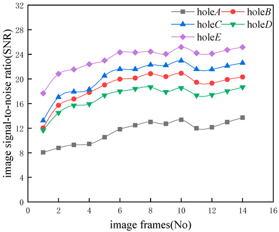 For the multi-frame imaging of the left-rank arc sparse array, the gray information of the defects in the multi-frame images of the detected left-rank arc sparse array is shown in Table 4. The variation in image gray values for the same scatterer at the natural focus is relatively small and tends to be stable. As depicted in Figure 7, the image gray values of holes A, B, C, and D, located on both sides of the natural focus of the arc sparse array, remain almost unchanged across multiple frames. However, the image gray value of hole E on the natural focus demonstrates a significant change range. This is primarily due to the occurrence of the “edge effect” at hole E, leading to a substantial fluctuation in the signal-to-noise ratio of the image. Specifically, with the eighth frame sequence as the reference, its signal-to-noise ratio is the lowest and follows a general trend of initially decreasing and then increasing. Furthermore, the 14th frame image corresponds to the full-frame left-rank image, representing full-frame full-rank imaging. Interestingly, the gray level of this image remains approximately equal to the gray levels observed in other frame sequence images. In other words, if we focus solely on the gray level of the scatterer image, single-frame left-rank imaging can be employed as a substitute for full-frame imaging, as it requires less time to obtain the desired imaging results.
