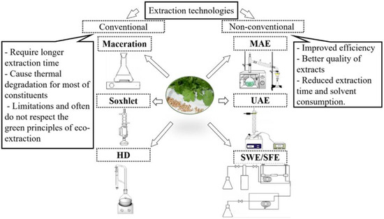 Phytochemical analyses have highlighted that coriander parts are rich sources of bioactive compounds [24]. In order to improve the coriander practicality, and in particular, to increase the availability of health promoting molecules, various extraction methods have been exploited to maximize the extraction of the active ingredients of this herb (Figure 2). This section will discuss the conventional and state-of-the-art techniques applied to obtain bioactive compounds from coriander.