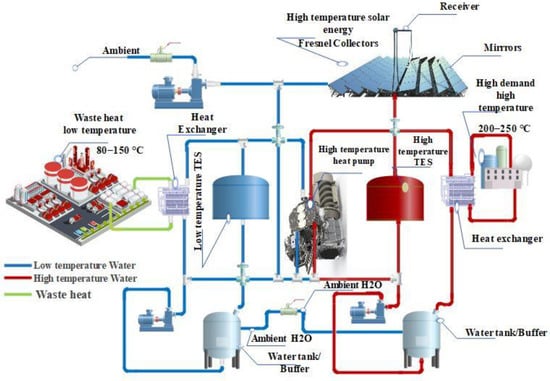 SUSHEAT incorporates several novel technologies such as an HTHP, a PCM bio-inspired TES system, and a CIT system for advanced heat upgrading in leading laboratories [25]. Moreover, SUSHEAT effectively assesses the best integration of heat upgrading systems, incorporating key enabling components and leveraging off-the-shelf renewable energy systems, such as solar Fresnel collectors, to enhance feasibility even at low temperatures. On the other hand, the integration depends on harvesting energy from waste heat, utilizing a linear Fresnel collector (LFC), and using ambient heat as a reservoir.