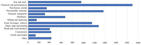 Concerning the heat demand in each industrial sector, Figure 6 illustrates that the chemical and petrochemical sector recorded the highest demand at 328.8 TWh, followed by iron and steel (289.2 TWh), non-metallic minerals with a value of 279.4 TWh, and food and beverages along with a value of 208.9 TWh. Subsequently, this was followed by lower demand for paper, pulp, and printing (106.3 TWh), machinery (95.4 TWh), non-ferrous metals (84.6 TWh), unspecified industries (82.8 TWh), and construction (63 TWh) (see Figure 6).