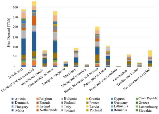 The industrial sectors exhibiting the lowest heat demand were transport equipment (28.7 TWh), textiles and leather (22.2 TWh), mining and quarrying with a value of 13.9 TWh, and wood products with a value of 3.7 TWh as shown in Figure 6 [7,26]. Thus, the industries with the greatest heat demand were identified in Germany, France, Italy, Spain, and the United Kingdom. Within the EU28, the SPIRE industries exhibited the highest overall heat demand.