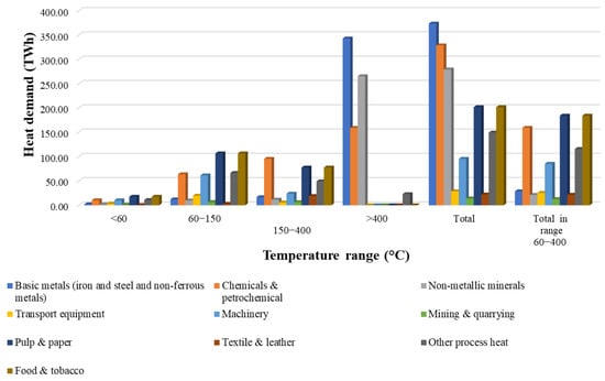 The heat demand categorized by temperature range for industrial sectors in EU28 [31].