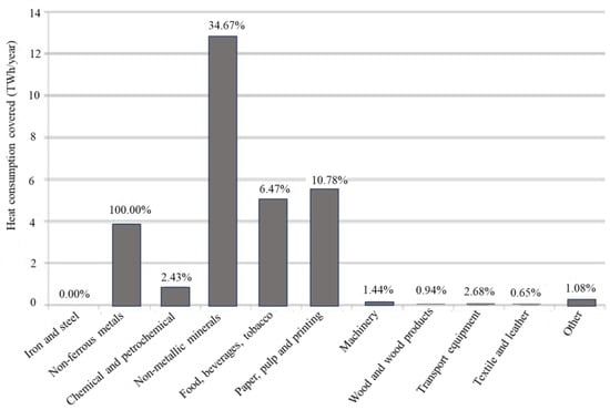 This proportion decreases to around 35% in the non-metallic minerals and drops to nearly 11% in paper industries (Figure 8). In the food sector, the proportion is roughly 6.5%, and in the chemical industries, it is even lower [29]. In industries with lower energy demand, the potential for sustainable solutions is notably limited, accounting for only 1–2% of heat consumption. Nevertheless, even within these sectors, viable sustainable approaches can be achieved, as seen in the textile industry.