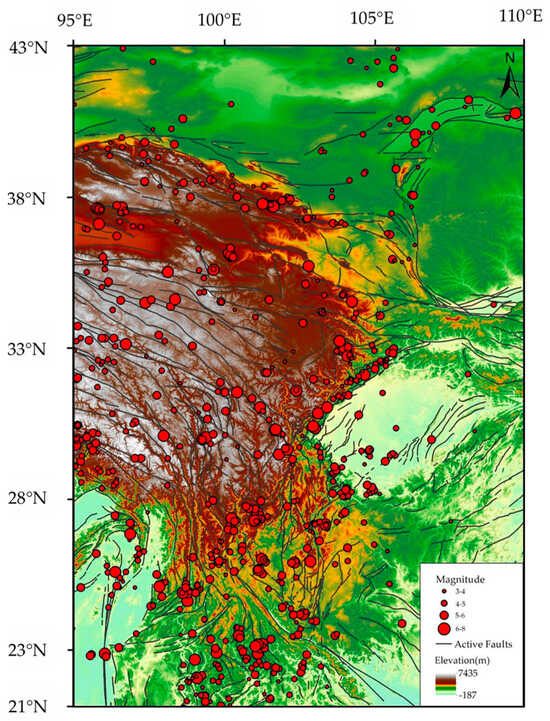 The extent of the North–South Seismic Belt has not yet reached a unified understanding [30,31,32]. Taking everything into account, this paper considers the region within 21.0° N to 43° N and 95° E to 110° E as the North–South Seismic Belt; see Figure 1.