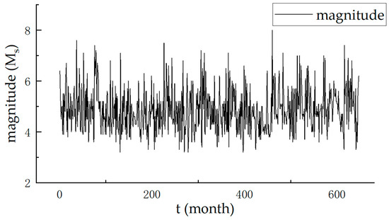 From January 1970 to December 2023, there were 280 months in which the maximum monthly earthquake magnitude in the North–South Seismic Belt exceeded Ms 5.0 out of a total of 648 months. This means that, on average, an earthquake with magnitude Ms 5.0 or higher occurs in this region approximately every three months. Earthquakes of this magnitude can be relatively damaging, potentially causing severe damage to buildings, infrastructure disruption, and even casualties. Due to the immense energy released, such earthquakes can have a significant impact on the socio-economic conditions and daily lives of people in the epicenter and surrounding areas. Therefore, earthquake prediction for this region is of considerable importance. The distribution of the maximum monthly magnitudes in the North–South Seismic Belt is shown in Figure 1.