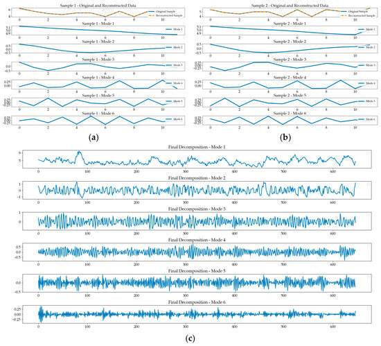 VMD results with a time window size of 12: (a) decomposition results for the first sample; (b) decomposition results for the second sample; (c) decomposition results for the entire dataset.