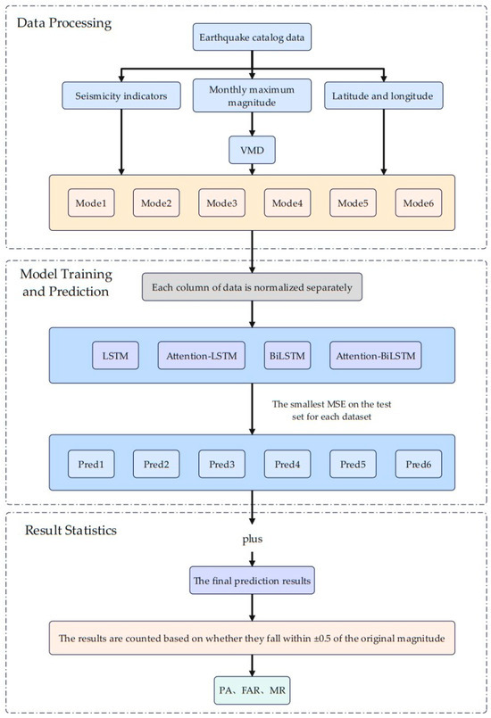 In this paper, the North–South Seismic Belt is treated as a whole. The monthly maximum magnitudes for this region are extracted and subjected to VMD, resulting in 6 columns of data. These six columns are combined with seismological parameters calculated from the earthquake catalog to form a new dataset. Different deep learning methods are applied to these datasets for hyperparameter analysis. For each dataset, the parameters corresponding to the minimum Mean Squared Error (MSE) are selected as optimal parameters to obtain the corresponding prediction results. Finally, the prediction results from multiple modalities are summed to obtain the final prediction result. The FA, FAR, and MR for each model are calculated. The model with the highest forecast accuracy is selected as the optimal model. In the prediction process, a rolling time window approach is used with windows of sizes 6, 12, 18, and 24. The results are also compared with those obtained without VMD, directly using magnitudes for prediction. The general process is similar for different time windows and models. Figure 4 illustrates the specific process of the experiment.