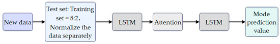 To better capture important information in the data, this paper introduces the ATT into the deep learning models LSTM and BiLSTM. The principle has already been introduced earlier. We added an ATT layer between the two layers of LSTM and the two layers of BiLSTM, respectively. Here, we take the newly formed dataset as an example, and the specific processing steps of ATT-LSTM are shown in Figure 7.