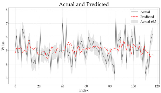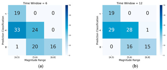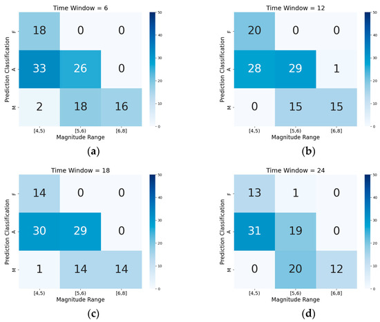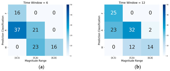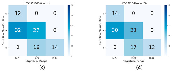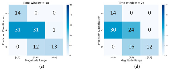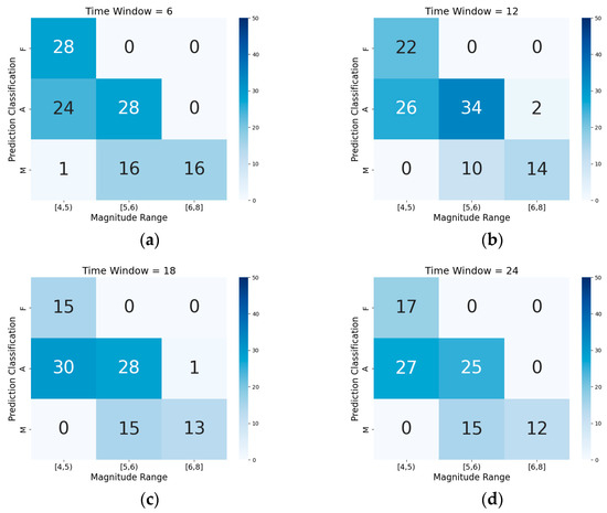It is generally considered that a forecast is accurate if the predicted magnitude is within Ms ±0.5 of the actual magnitude. If the predicted magnitude is more than Ms +0.5 above the actual magnitude, it is defined as a false alarm. If the predicted magnitude is more than Ms −0.5 below the actual magnitude, it is defined as a missed alarm [43]. This paper mainly studies the prediction effects for magnitudes Ms 5.0–6.0 and above Ms 6.0. Therefore, when treating this as a regression problem, the actual magnitude range needs to be predefined. Hence, the PA, FAR, and MR in this paper are calculated under the premise that the actual magnitudes are between Ms 5.0 and 6.0 and above Ms 6.0. Suppose we are calculating the metrics for earthquakes with actual magnitudes greater than or equal to Ms 5.0 but less than Ms 6.0. Let N represent the total number of samples with actual magnitudes between Ms 5.0 and 6.0, A represent the number of samples where the predicted magnitude is within Ms ±0.5 of the actual magnitude, F represent the number of samples where the predicted magnitude is more than Ms +0.5 from the actual magnitude, and M represent the number of samples where the predicted magnitude is more than Ms −0.5 from the actual magnitude. The metrics are defined as follows: