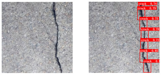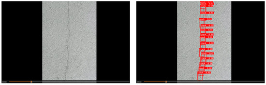 We deployed our proposed detection model on an edge device and tested it. We used pictures and videos from two different environmental situations for validation, and the test results showed that the inference time for a single picture was only 11.3 ms, and video detection achieved a speed of 83 frames per second, meeting the detection requirements in practical engineering applications. However, we found that during video detection, some small cracks could not detected if the camera moved too quickly. We suspect that the issue was caused by a mismatch between the model’s response speed and the camera’s movement speed.