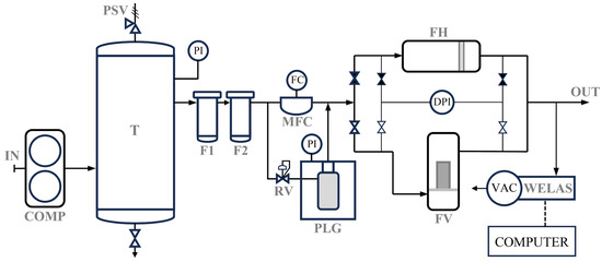 Figure 2. The experimental setup for testing gas–liquid coalescing media is as follows: COMP-rotary gas compressor; T—compressed air feed tank; F1, F2—air cleaning filters; MFC—mass flow controller; RV—reducing valve; PLG—aerosol generator; FH—horizontal filter housing (for flat media); FV—vertical filter housing (for cartridge filters); VAC—vacuum pump; WELAS—particle counter.