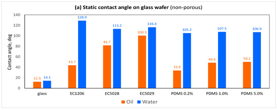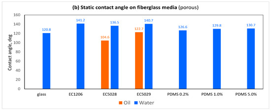 Three modifications were carried out using three types of commercial solutions purchased from NanoX: EC1206, EC5208, and EC5029. The second group of surface treatments was the PDMS from its solutions in the hexane. The coatings were applied to the fiberglass filtration material and also to the wafers made of borosilicate glass following the same procedure. The results of the static contact angle with the oil and the water droplet are presented in Figure 4. For the porous filter media, it was possible to analyze the contact angle of the sessile droplet when no liquid penetration into the material occurred, i.e., for the values of contact angle above 90°. This is why some of the measurement data with the oil shown in Figure 4b are missing.