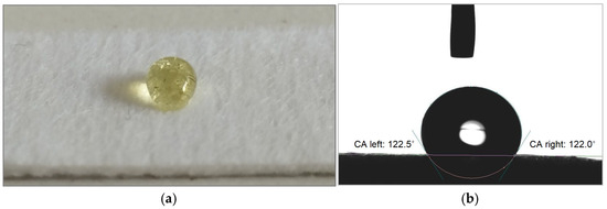 The oil droplet on the oleophobic fiberglass coated with EC5029: (a) a real photo; (b) an image from a goniometer.