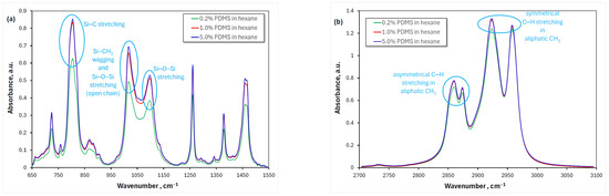 The FTIR spectra of the fiberglass coated with PDMS for the range of the wavenumber: (a) 650–1550 cm−1; (b) 2700–3100 cm−1. Peaks related to characteristic chemical bonds in the PDMS were identified.