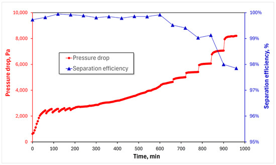 Most of the presented studies on gas–liquid coalescing filters concern the assessment of their efficiency in the initial state or, more importantly, from the practical point of view, after reaching saturation and stabilizing the pressure drop value (which is achieved for an ideal system without the content of solid particles). In their work, Bredin and Mullins attempted to assess the change in the efficiency of aerosol droplet separation caused by interruptions in operation and draining the oil from elements during downtime [20]. They presented the results in subsequent on–off cycles for different pauses of the flow, different modes of saturation of elements with the oil, and cleaning using the reversed flow. For selected structures, they reached the final steady-state values at a similar level, regardless of the system operation mode (saturation procedure and length of the break without aerosol flow). Kolb and Kasper discussed the “dP creep” and the liquid rearrangement inside the filter media for different flow velocities, loading rates, and saturation scenarios (i.e., starting from dry/clean filter or presaturated) [21]. They concluded that reaching steady-state saturation can correspond to different dP values depending on the experimental conditions and properties of filter media. Moreover, they advised that the saturation reaches a stable endpoint sooner than the pressure drop, and the creeping of the dP value may continue for the filter lifetime.