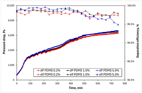 The results of the oil mist separation experiment for PDMS-coated media are presented in Figure 11. Very similar profiles of the pressure drop versus time were obtained for all three concentrations; however, the lowest terminal dP value and the smallest variations for the saturated element were observed for the modification carried out using the 0.2% concentration of the polymer in the hexane.