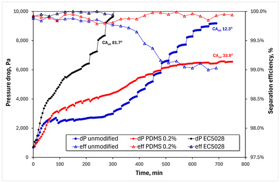 The comparison of the coalescence performance for the filter media coated using three commercial solutions from NanoX is presented in Figure 10. The differences between them are very pronounced. The EC1206 coalescing filter operates in a very similar way to unmodified material; however, the dP values are higher, and the upper limit of the dP sensor was exceeded after twelve hours. Moreover, the stepwise increase of the pressure drop caused by the flow interruption was not eliminated. This issue was significantly reduced for both oleophobic coatings, EC5028 and EC5029. In the case of material coated by the EC5029, a very fast increase of the pressure drop was observed, reaching the maximum measurable value in 5 h (see Figure 10). Although for this material the efficiency was the highest, the filter was blocked by the oil, which was probably kept on the upstream part of the filter. During the breaks of the system operation, an additional amount of oil was probably pushed out from the porous material driven by the capillary forces, which caused an additional increase in the dP. The filter modified using the EC5028 performed the best. The dP jumps were significantly reduced when the element was saturated with the oil. In addition, the efficiency did not decrease at the end of the test, which was observed for the unmodified material.