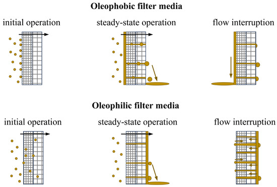 It seems that the performance of oleophobic material should be much better in terms of self-cleaning of the filter on the upstream side of the filter where the oil film is created, as shown schematically in Figure 14. However, if the capillary forces acting on the oil so that they confine it to entering the liquid into porous material are too high, it can lead to a massive accumulation of the oil on the inlet and filter blockage. This effect was observed for highly oleophobic modifications obtained by coating with the commercial products EC5028 and EC5029 (Figure 10). The measurements of the contact angle with oil (Figure 4) confirm this hypothesis. For these coatings, the increase in pressure drop was very fast, so that it exceeded the range of the dP sensor before the steady-state value was reached.