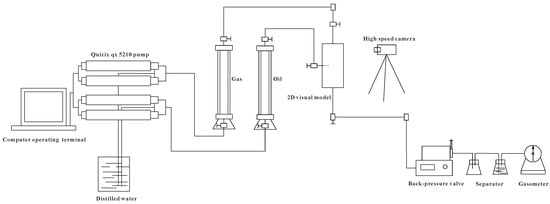 The experimental setup for the two-dimensional visual large-object model consists of five main components: the drive replacement system, the two-dimensional visual large-object model itself, a high-speed camera, a back pressure controller, and a fluid metering system. We utilized a high-pressure precision displacement pump, the Chandler Quizix QX5210, for the drive replacement system. The two-dimensional visual large-object model had a visual area of 170 × 150 mm, with a maximum working pressure of 22 MPa and a working temperature of up to 110 °C. Distilled water served as the pressure transfer medium, and non-mercury piston pressurization was used to apply pressure to the test fluid. The flow chart of the two-dimensional visualization experiment device is shown in Figure 1 [].