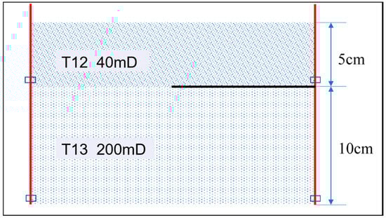 A core model was prepared using sand-filling technology to replicate the strong heterogeneity of the formation in the target block. The model was designed as a double-layer oil reservoir with an internal interlayer and a permeability gradient. The model featured a permeability gradient with a spacer, in which the permeability of the upper T12 reservoir was 40 mD and the thickness was 5 cm, while the permeability of the lower T13 reservoir was 200 mD and the thickness was 10 cm. The visible area of the model measured 170 × 150 mm. The pore diameter was 0.1~0.2 cm, and the pore length was about 12 cm, from which it can be concluded that the pore volume of the microscopic model was about 0.0942~0.3768 cm3. The design of the large model and the physical diagram of the model are shown in Figure 2 [].