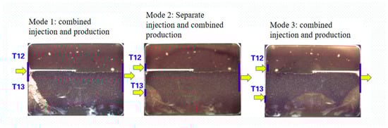 T12 has a permeability of 40 mD and a thickness of 5 cm, while T13 has a permeability of 200 mD and a thickness of 10 cm. According to the distribution location of the spacer and the physical properties of the two small layers, TI2 and TI3, three groups of two-dimensional visual physical simulation experiments were designed. For the spacer located at the injection end and the extraction end, the experiments were simulated using combined injection and extraction and split injection and extraction modes, respectively. Table 1 shows the different injection and production model schemes, and Figure 3 illustrates the different injection and production design schemes.