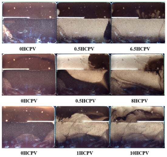 - After the completion of the experiment, the collected data were analyzed to evaluate the macroscopic progression and coverage (wave and reach) of carbon dioxide in porous media and its impact on the displacement of oil and the change in the oil–gas interface []. In this context, “wave” refers to the movement of the injected carbon dioxide as it advances through the reservoir, forming a front that displaces the oil. “Reach” describes how far this wave extends and how effectively it sweeps through the reservoir, displacing oil from the rock matrix. Evaluating these characteristics helps to understand the efficiency of the recovery process and the extent to which the injected carbon dioxide can displace oil from the reservoir.