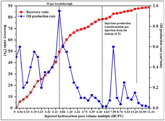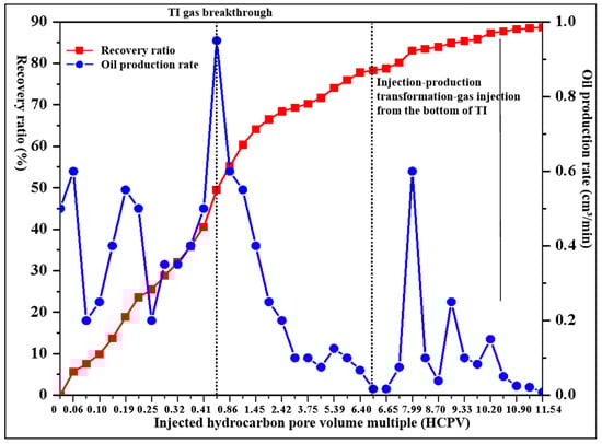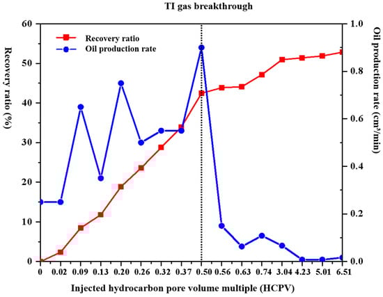Figure 7 illustrates the curves of the recovery degree and the oil recovery rate under different HCPV co-injection and co-production conditions. It can be observed that as the HCPV increased, the recovery degree initially rose rapidly before slowing down, with a critical HCPV of 0.5. The oil production rate initially increased in a wave-like pattern, then rapidly decreased, and subsequently declined more gradually. The HCPV at the TI gas breakthrough point was 0.5. The TI gas breakthrough indicates the point at which gas begins to break through into the production wells, marking a significant change in the flow dynamics and recovery efficiency [].