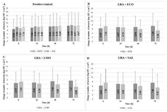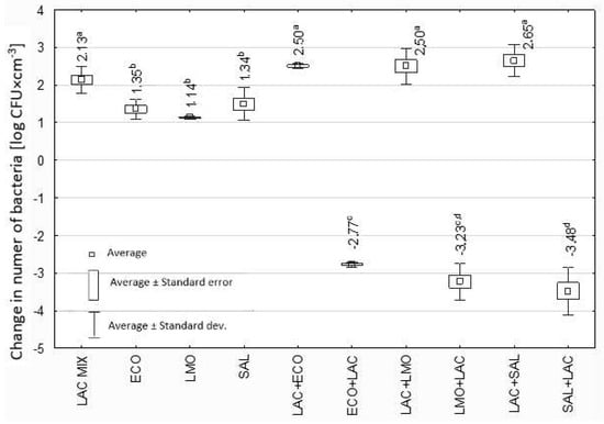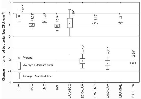 Changes in the number of L. rhamnosus and foodborne bacteria after 72 h of incubation in individual cultures (LRA—L. rhamnosus; ECO—E. coli; LMO—L. monocytogenes; SAL—S. Enteritidis) and in mixed cultures (LRA+ECO—changess in the number of L. rhamnosus in a mixed culture of L. rhamnosus and E. coli; ECO+LRA—changes in the number of E.coli in a mixed culture of L. rhamnosus and E. coli; LRA+LMO—changes in the number of L. rhamnosus in a mixed culture of L. rhamnosus and L. monocytogenes; LMO+LRA—changes in the number of L. monocytogenes in a mixed culture of L. rhamnosus and L. monocytogenes; LRA+SAL—changes in the number of L. rhamnosus in a mixed culture of L. rhamnosus and S. Enteritidis; SAL+LRA—changes in the number of S. Enteritidis in a mixed culture of L. rhamnosus and S. Enteritidis). a–c—values marked with different letters differ in a statistically significant way (p ≤ 0.05).