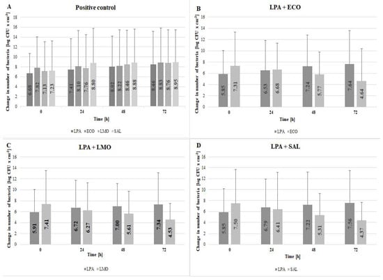 Changes in the number of bacteria in relation to culture time. (A) Positive control. (B) Changes in the number of bacteria in a culture of L. paracasei with E. coli. (C) Changes in the number of bacteria in a culture of L. paracasei with L. monocytogenes. (D) Changes in the number of bacteria in cultures of L. paracasei and S. Enteritidis. LPA—L. paracasei; ECO—E. coli; LMO—L. monocytogenes; SAL—S. Enteritidis; CFU—colony-forming unit.