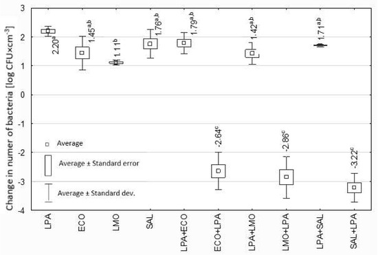 Changes in the number of L. paracasei and foodborne bacteria after 72 h of incubation in individual cultures (LPA—L. paracasei; ECO—E. coli; LMO—L. monocytogenes; SAL—S. Enteritidis) and in mixed cultures (LPA+ECO—changes in the number of L. paracasei in a mixed culture of L. paracasei and E. coli; ECO+LPA—changes in the number of E.coli in a mixed culture of L. paracasei and E. coli; LPA+LMO—changes in the number of L. paracasei in a mixed culture of L. paracasei and L. monocytogenes; LMO+LPA—changes in the number of L. monocytogenes in a mixed culture of L. paracasei and L. monocytogenes; LPA+SAL—changes in the number of L. paracasei in a mixed culture of L. paracasei and S. Enteritidis; SAL+LPA—changes in the number of S. Enteritidis in a mixed culture of L. paracasei and S. Enteritidis). a–c—values marked with different letters differ in a statistically significant way (p ≤ 0.05).