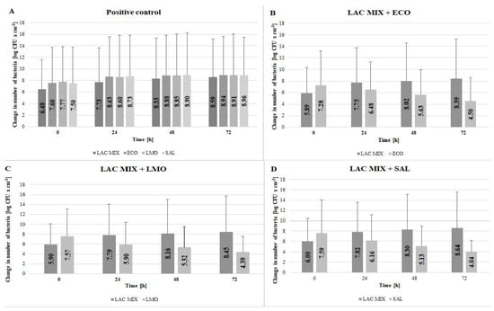 Changes in the number of bacteria in relation to culture time. (A) Positive control. (B) Changes in the number of bacteria in a culture of L. paracasei+L. rhamnosus (LAC MIX) with E. coli. (C) Changes in the number of bacteria in a culture of L. paracasei+L. rhamnosus (LAC MIX) with L. monocytogenes. (D) Changes in the number of bacteria in cultures of L. paracasei+L. rhamnosus (LAC MIX) and S. Enteritidis. LAC MIX—L. paracasei+L. rhamnosus; ECO—E. coli; LMO—L. monocytogenes; SAL—S. Enteritidis; CFU—colony-forming unit.