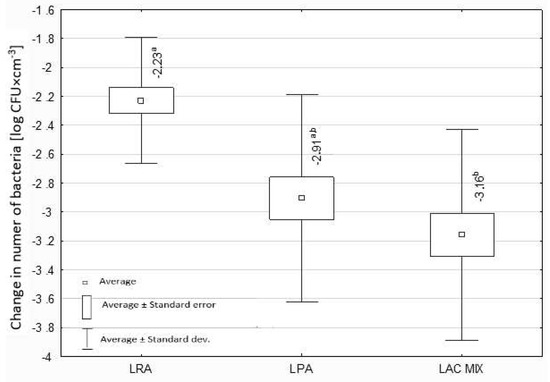Changes in the number of tested foodborne bacteria in the presence of individual Lactobacillus species (LRA—Lactobacillus rhamnosus; LPA—Lactobacillus paracasei; LAC MIX—L. rhamnosus and L. paracasei). a–c—values marked with different letters differ in a statistically significant way (p ≤ 0.05).