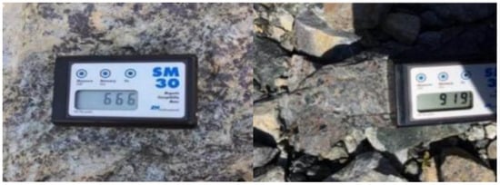 The practical geological environment of Earth is extremely complex. It is generally considered to have a resistivity range of 10−1–104 for the common environment. As for magnetic susceptibility, Figure 2 shows the magnetic susceptibility (ranging from 0.6~1 SI) of magnetite rock in Huayang, Shaanxi Province, China [22]. Additionally, the magnetic susceptibility values of some common minerals are provided in Reference [23], among which the magnetic susceptibility of magnetite varies from 1.2 to 19.2.