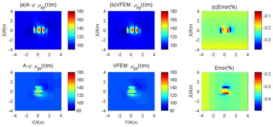 Figure 4 displays the apparent resistivities of the xy-mode and yx-mode. The first and second columns correspond to the apparent resistivities obtained from the method and the edge-based FEM, respectively. The third column shows the relative error, while the upper and lower rows represent xy-mode and yx-mode, respectively. Both methods exhibit a high level of accuracy, with relative errors less than 3%. Our aim is solely to validate this approach; therefore, we refrain from further analysis of Figure 5.