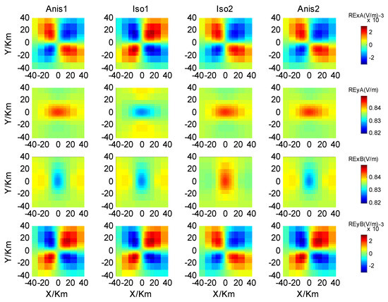 For the four models, Figure 7 and Figure 8 depict the real and imaginary components of the horizontal electric fields induced by two sources, i.e., Source A (Ex = 0, Ey = 1, Ez = 0) and Source B (Ex = 1, Ey = 0, Ez = 0) on the ground surface. The first to fourth columns correspond to the Anis1 model, the Iso1 model, the Iso2 model, and the Anis2 model, respectively. In Figure 7, the first to fourth rows correspond to the real parts of Ex induced by Source A (RExA), Ey induced by Source A (REyA), Ex induced by Source B (RExB), and Ey induced by Source B (REyB), respectively. In Figure 8, the first to fourth rows correspond to the imaginary parts of Ex induced by Source A (IExA), Ey induced by Source A (IEyA), Ex induced by Source B (IExB), and Ey induced by Source B (IEyB), respectively.