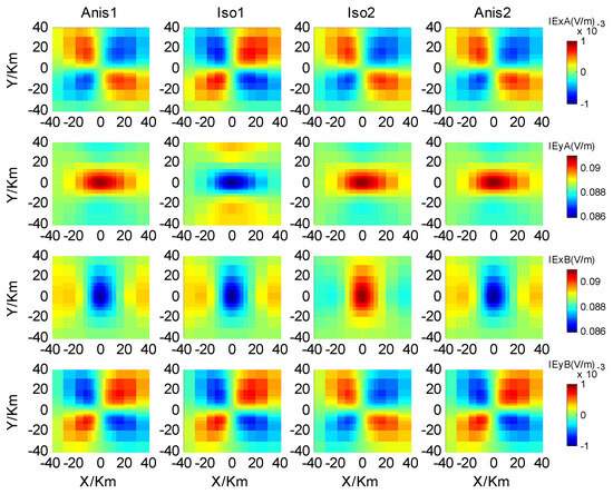 As depicted in Figure 6, RExB and REyB for the Iso1 model exhibit remarkable similarities to those of the Anis1 model; similarly, RExA and REyA for the Iso2 model closely resemble those of the Anis1 model. Notably, the fourth row mirrors the characteristics observed in the first row. As depicted in Figure 7, IExB and IEyB for the Iso1 model closely resemble those for the Anis1 model; IExA and IEyA for the Iso2 model demonstrate a similar pattern to those for the Anis1 model. Again, the fourth row closely resembles the first row.