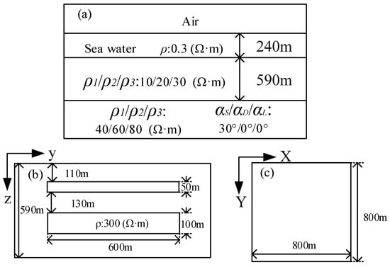 The marine model is depicted in Figure 9, where the first layer represents seawater, with a resistivity of 0.3 and a thickness of 240 m. The second layer has a thickness of 590 m, exhibits axial conductive anisotropy, and is characterized by three principal resistivities: 10 , 20 , and 30 respectively. The third layer is also anisotropic conductive, with three principal resistivities: 40 , 60 , and 80 respectively; additionally, it possesses Euler’s angles of 30°, 0°, and 0°, respectively.